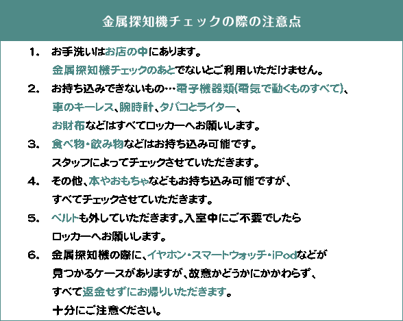 お荷物を入れていただいたあと、金属探知機を使ってチェックさせていただきます。電子機器が見つかった場合、すぐご退店いただき返金できません。十分ご注意ください。